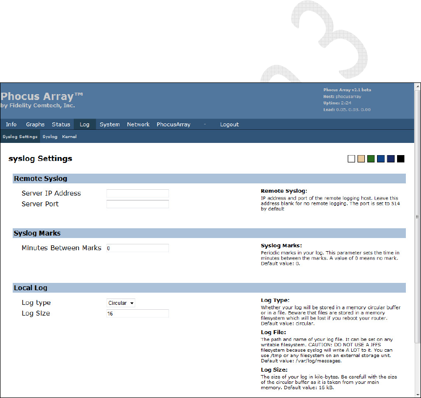 • Syslog Settings – remote syslog, syslog marks, local log