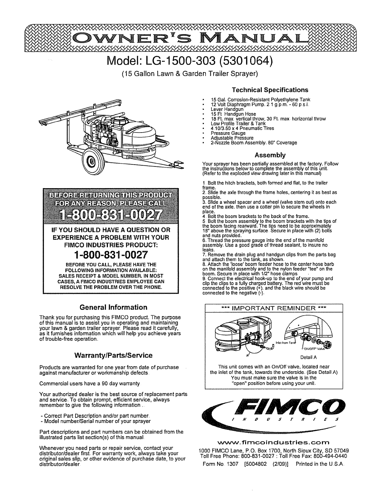Fimco LG 1500 303 User Manual LAWN & GARDEN TRAILER SPRAYER Manuals And Guides 1007366L