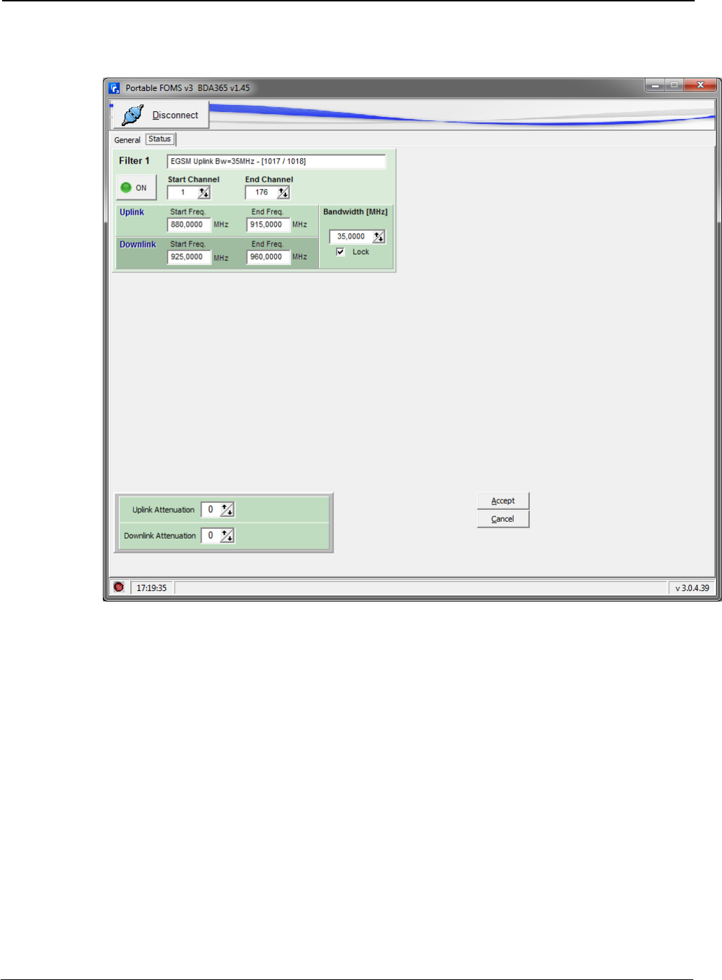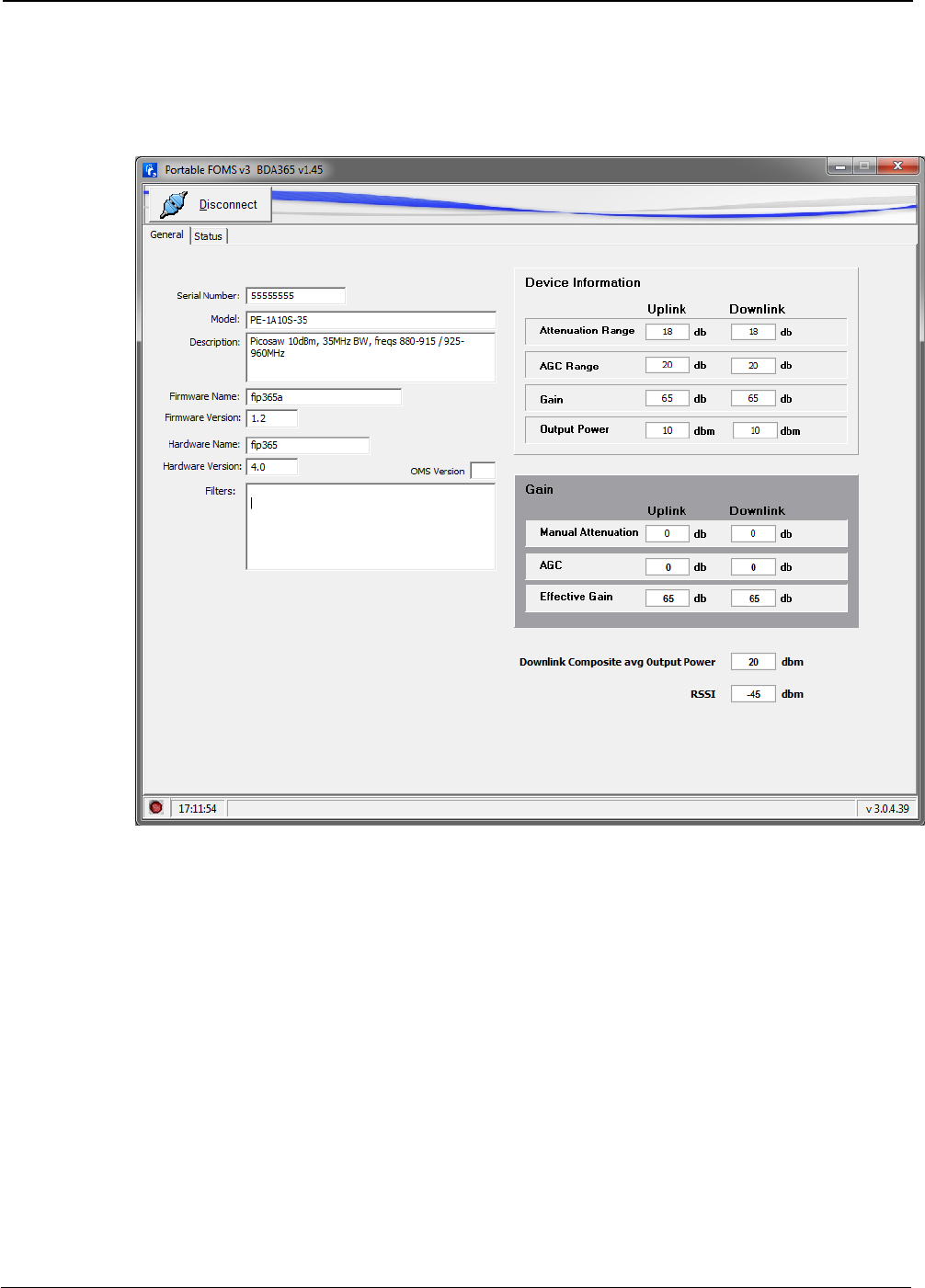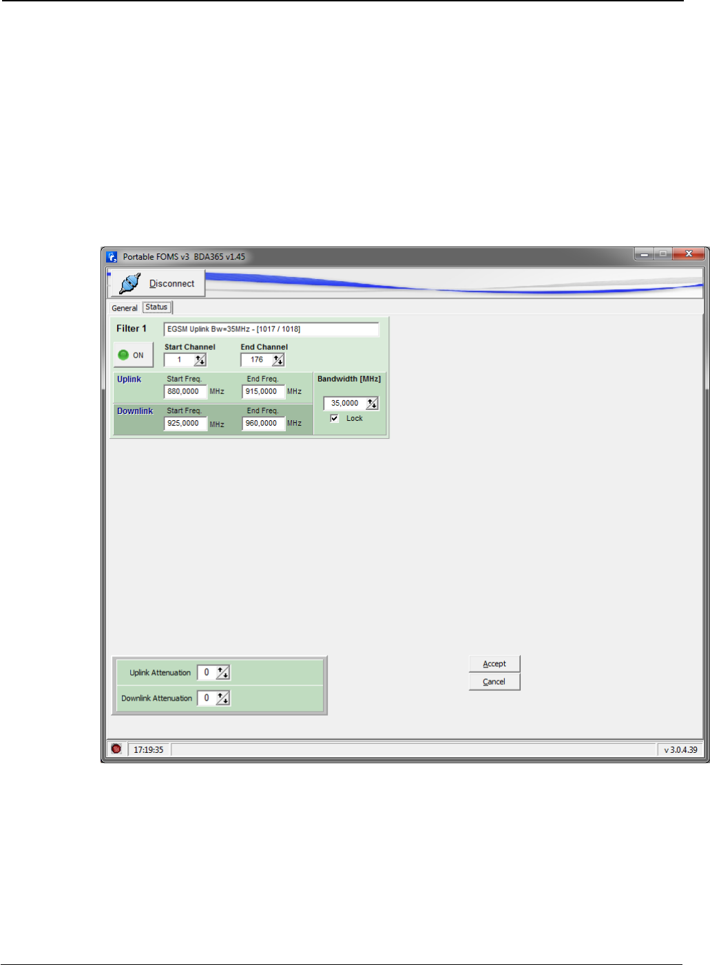 Gain: these fields allow user to know actual manual attenuation, AGC, and effective gain of