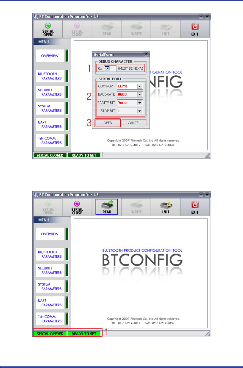 1 SERIAL OPENED, READ TO SET : BTConfig tool and communication status of products.
