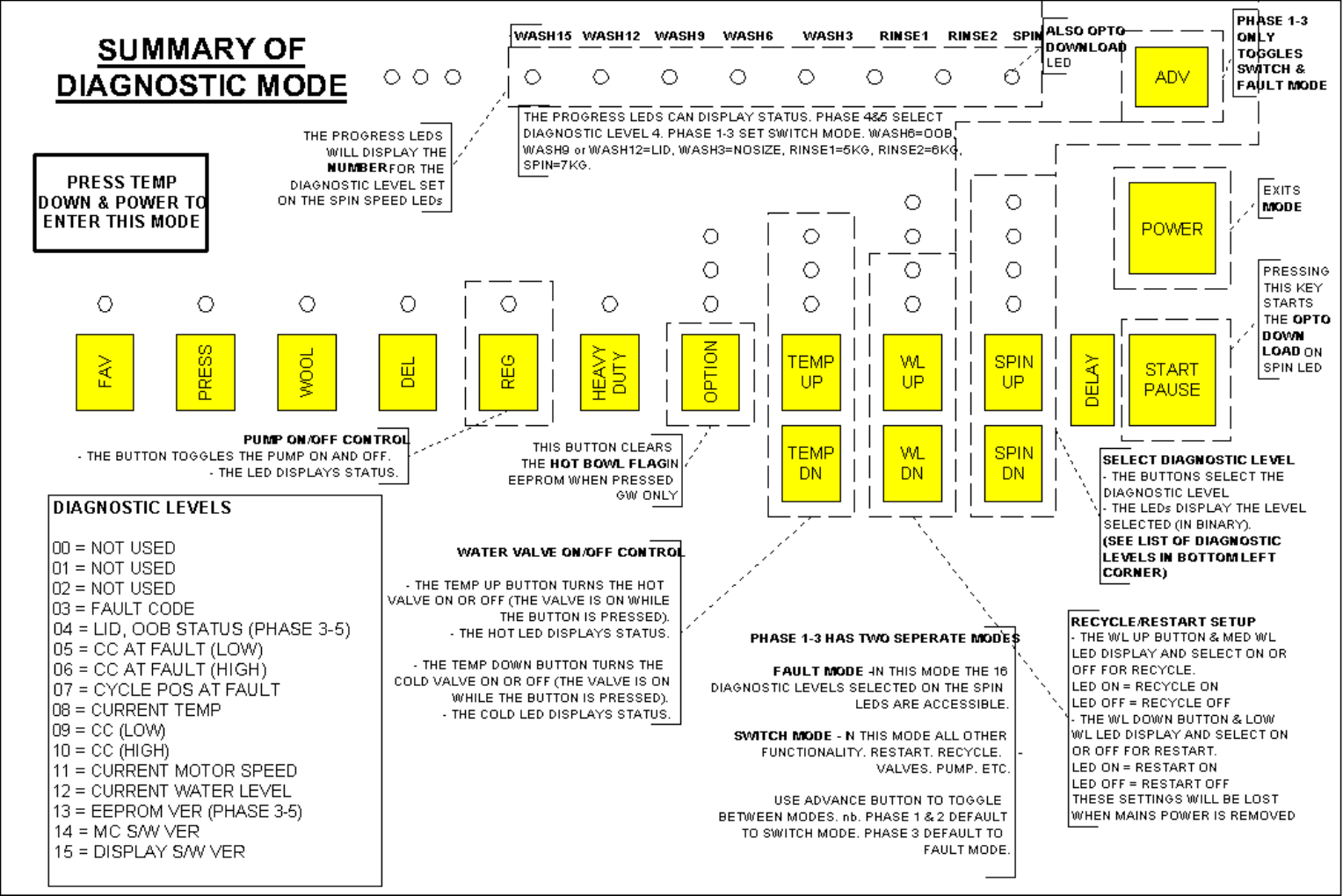 NB: The drain pump test, water valve test, restart, recycle and hot bowl flag can be accessed from any