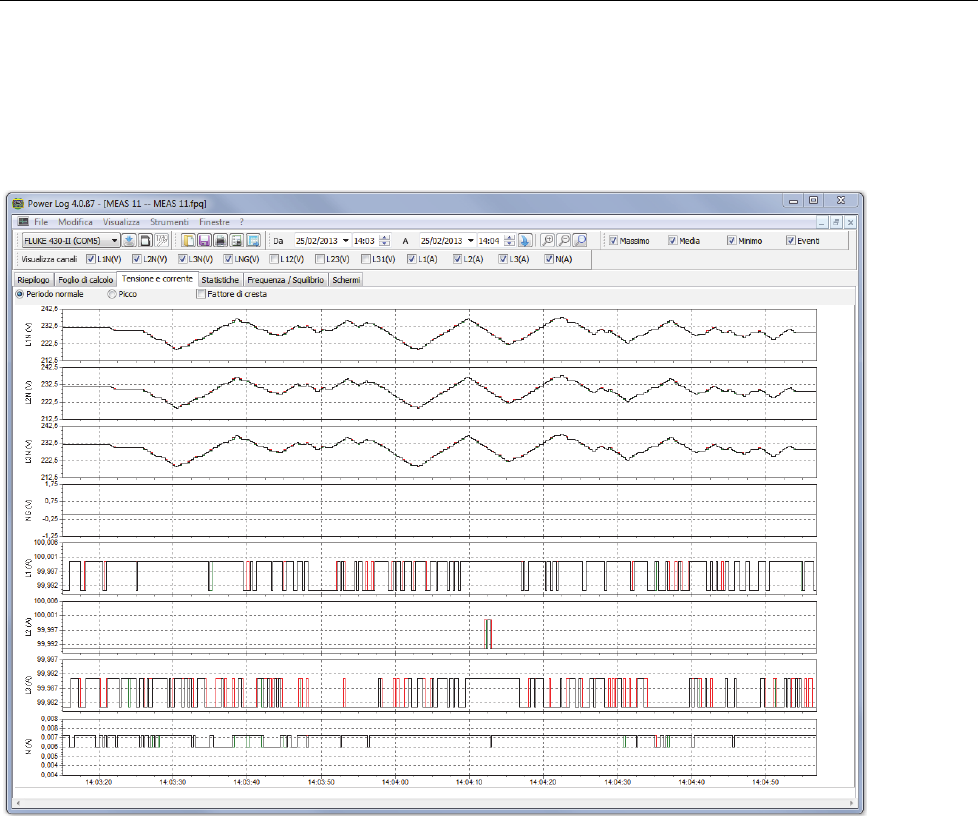 corrente catturate durante l'evento. Mostra 1 secondo (100/120 cicli) di dati per i segnali a