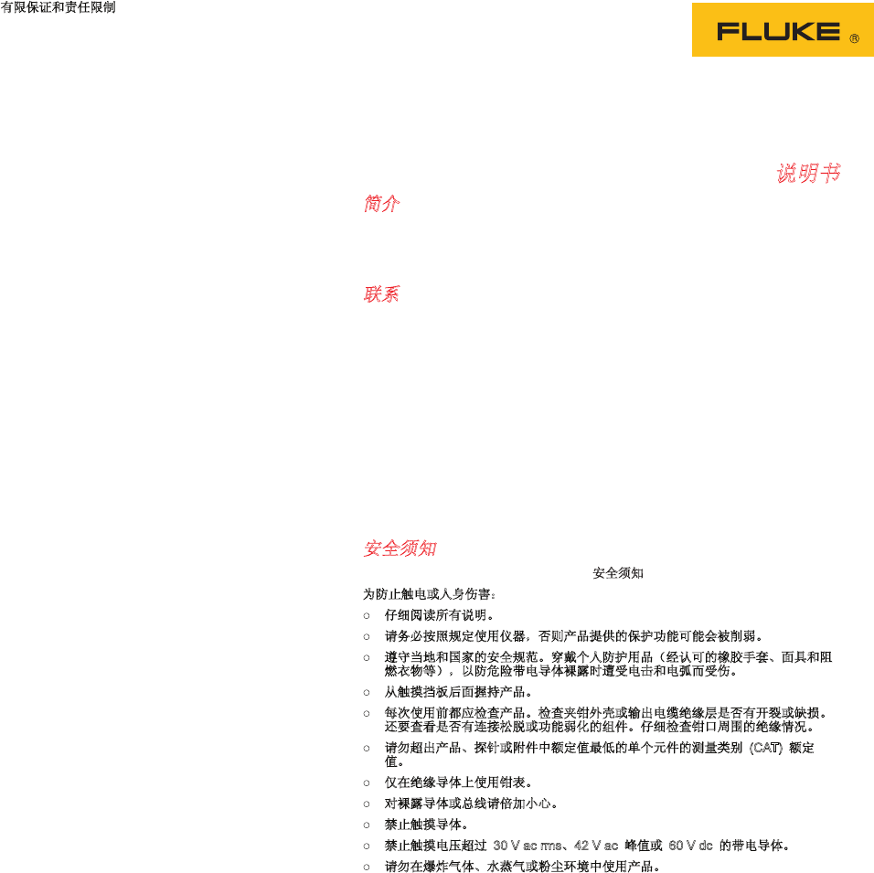 的操作或处理而造成的损坏。经销商无权以 Fluke 的名义提供其它任何保证。若要