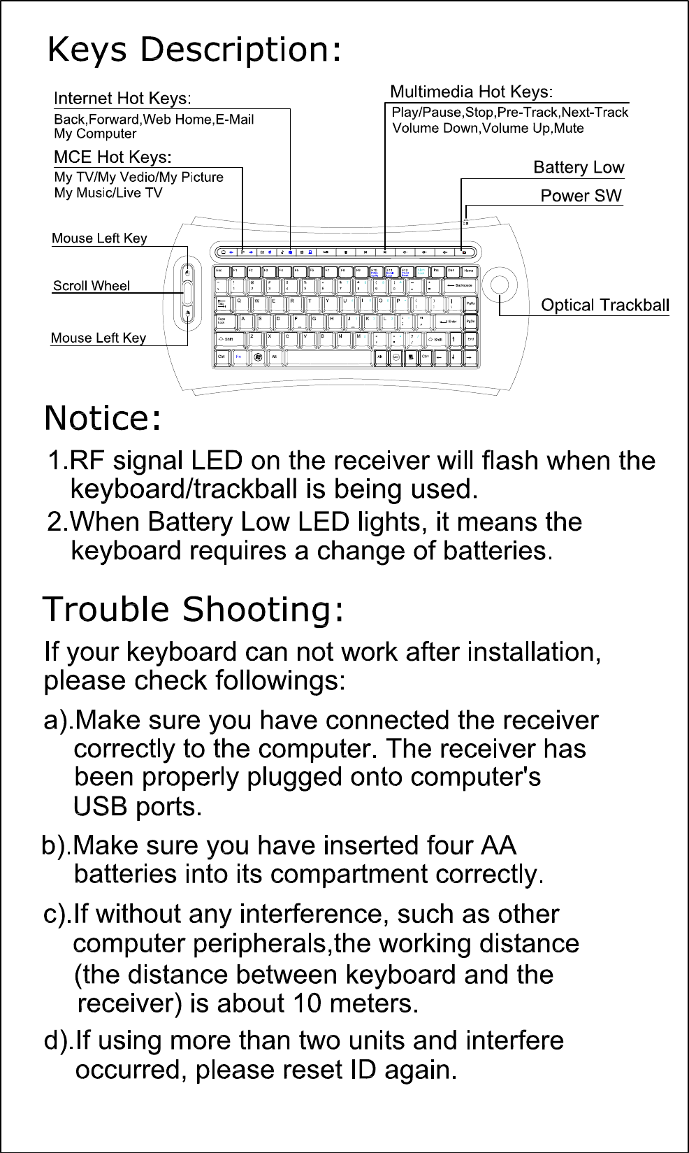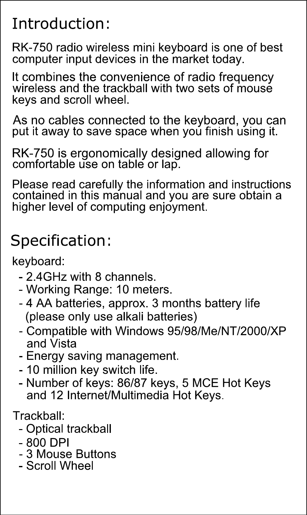 Focus Electronic Co RK750 Wireless Keyboard with Trackball User Manual RK750 Vista MCE Spec Model 1