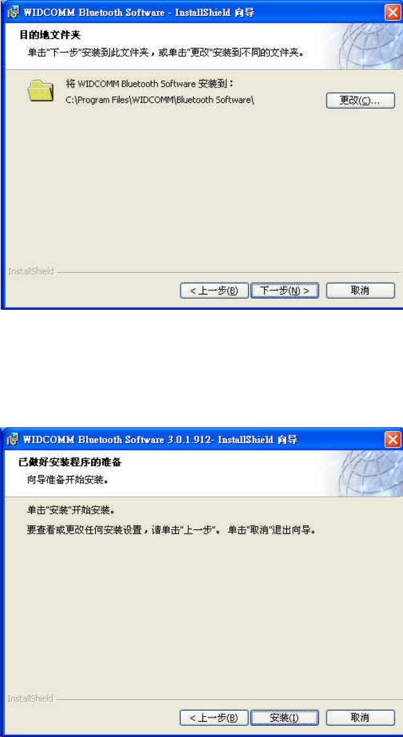 • 按"下一步",接受預設的安裝目錄,或是按下"變更"瀏覽您所想要新的藍芽