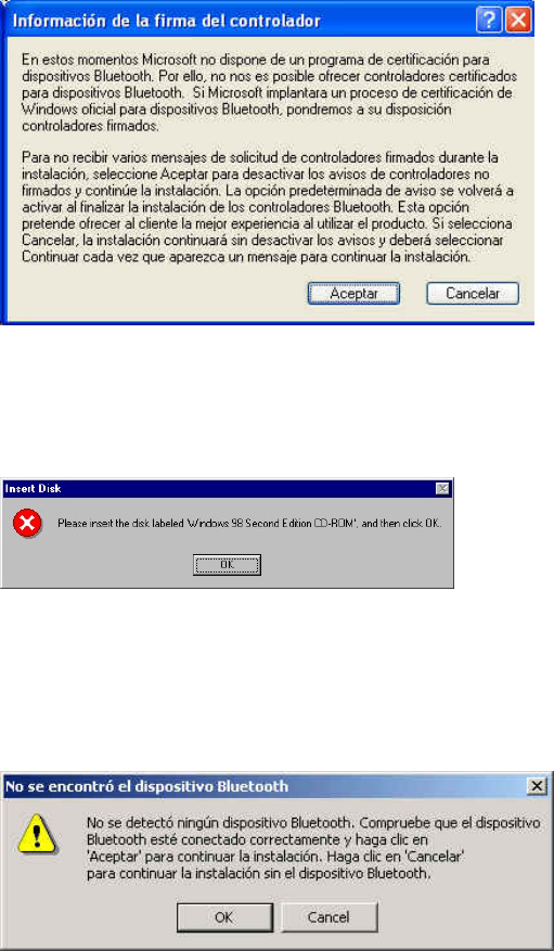 • Para los usuarios de Windows 98, aparecerá una ventana que le pedirá que inserte el