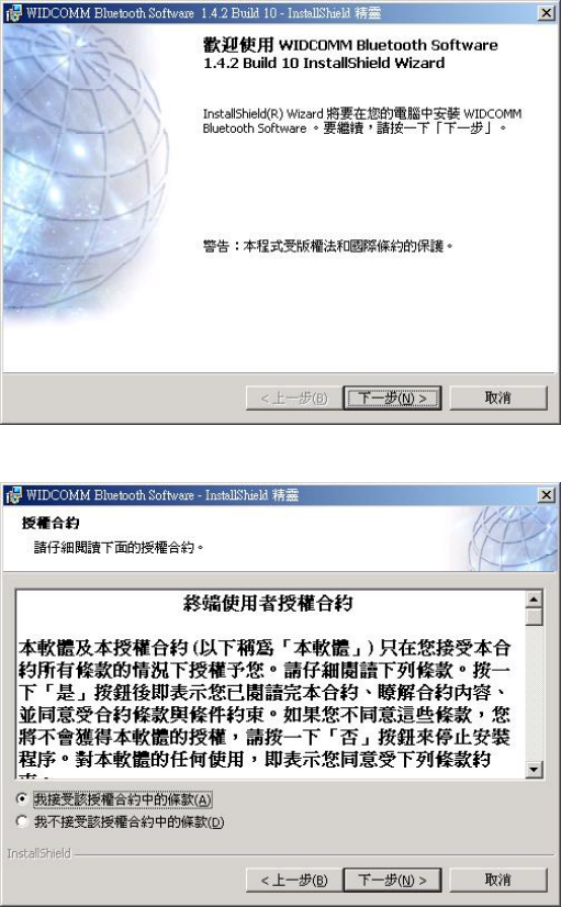 注意: 在使用藍芽配接器之前,請先安裝 Widcomm 的 Windows 版藍芽軟體