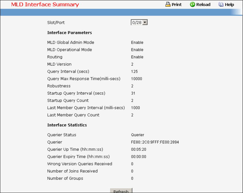 Querier Address - The address of the MLD querier on the IP subnet to which the selected interface is