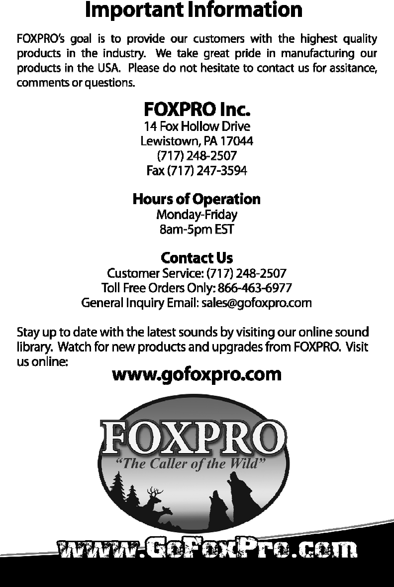Your FOXPRO wildlife caller is warranted to be free from defects in materials