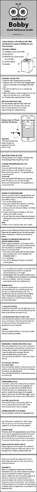 FreeTek BOB Bluetooth Speaker User Manual Bobby QRG EN CN 131120