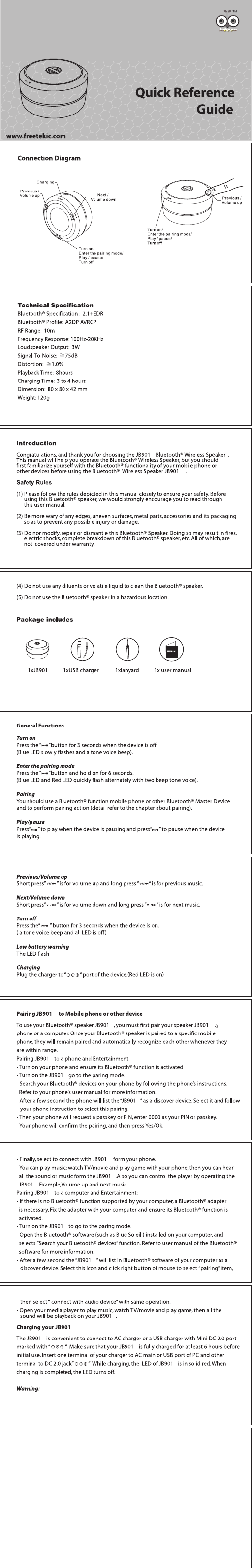 FreeTek JB901M Bluetooth Wireless Speaker User Manual
