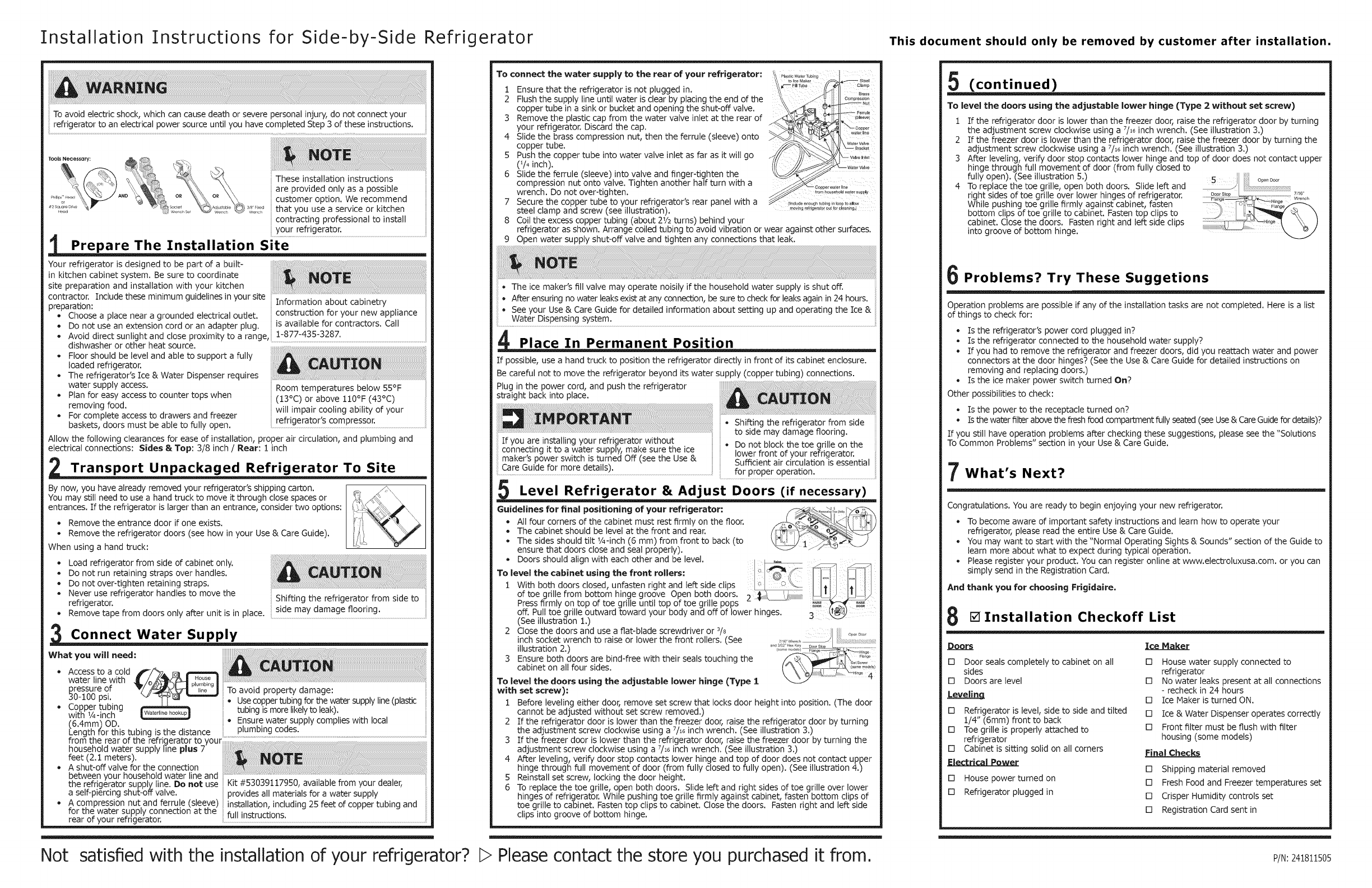 Installation Instructions for Side-by-Side Refrigerator This document should only be removed by customer after installation.
