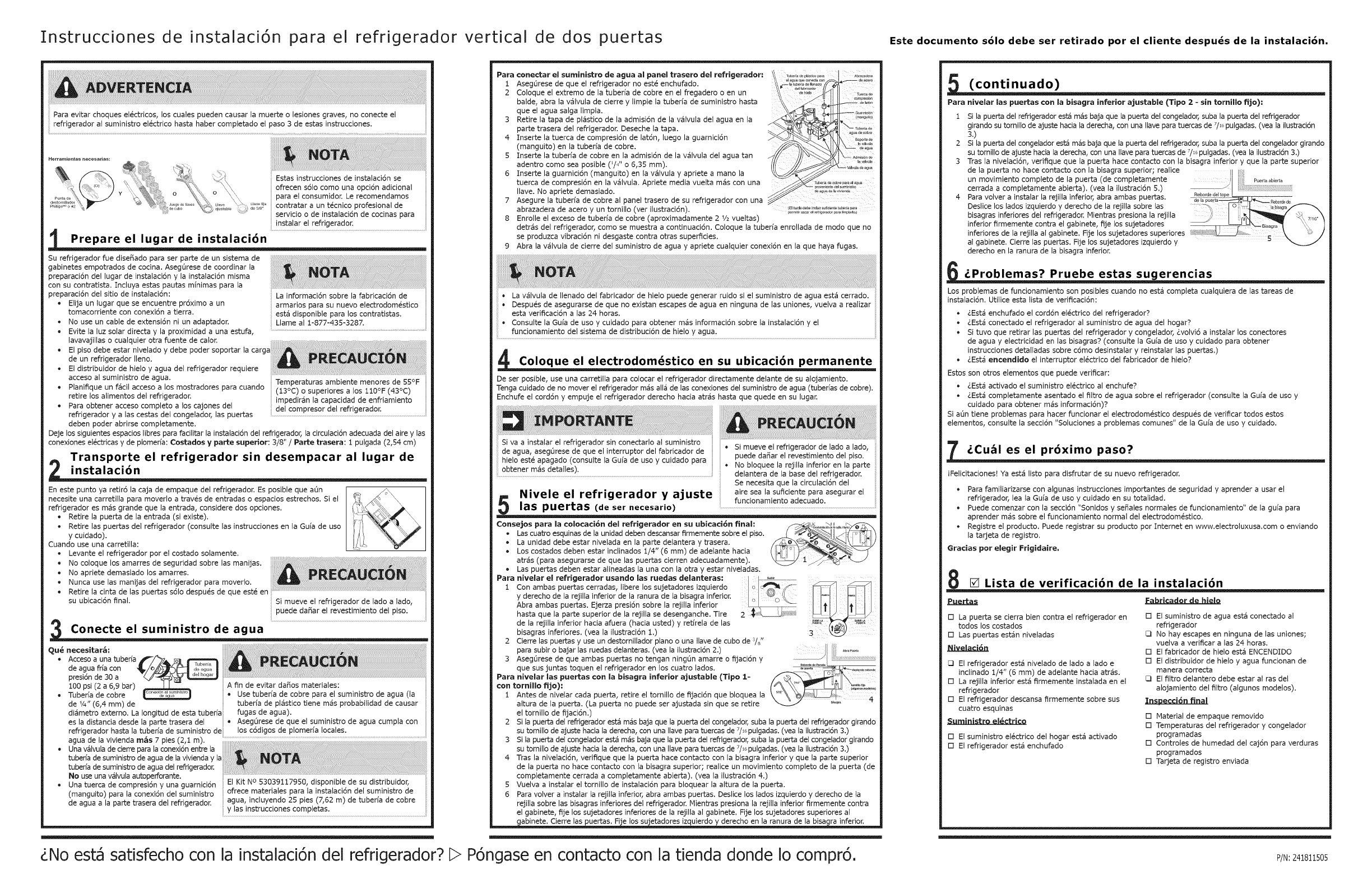 2_Noest satisfecho con la instalad6n del refrigerador? 1> P6ngase en contacto con la tienda donde Io compr6. P/N:241811505