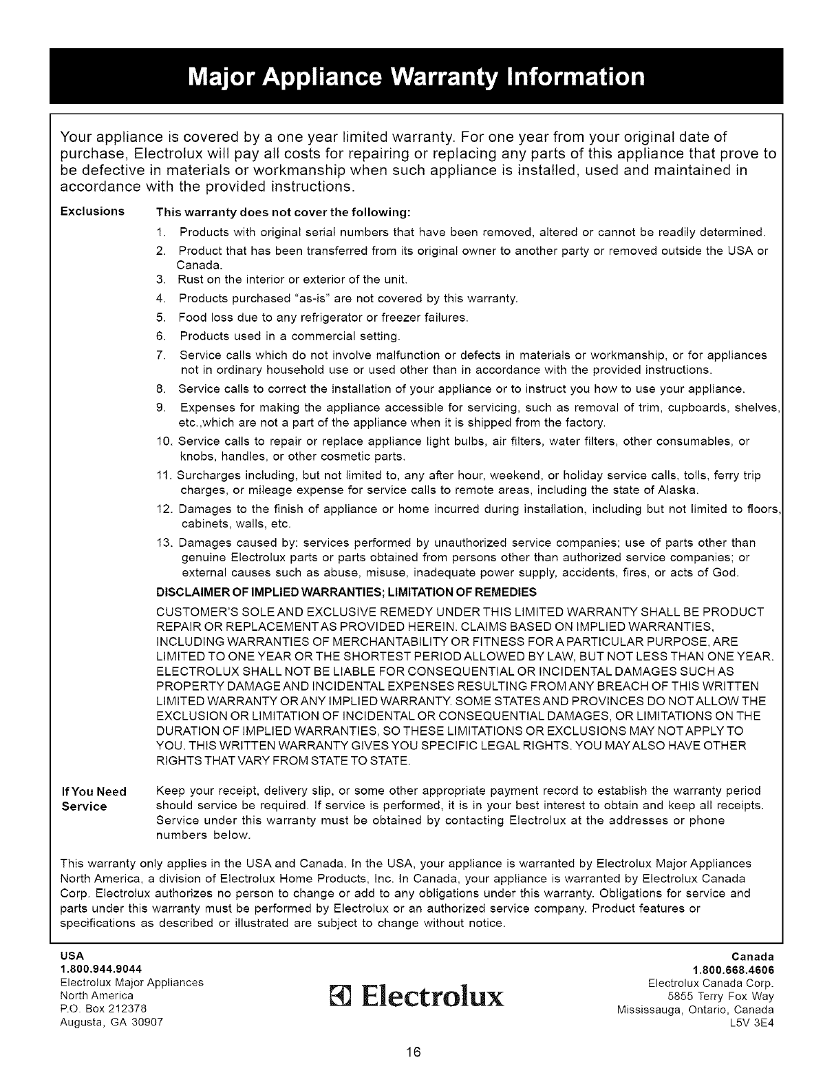 North America, a division of Electrolux Home Products, Inc. In Canada, your appliance is warranted by Electrolux Canada