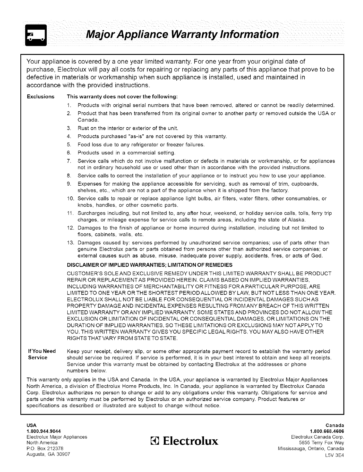 This warranty only applies in the USA and Canada. in the USA, your appliance is warranted by Electrolux Major Appliances