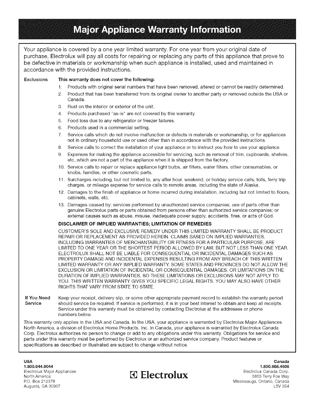 ELECTROLUX SHALL NOT BE LIABLE FOR CONSEQUENTIAL OR INCIDENTAL DAMAGES SUCH AS