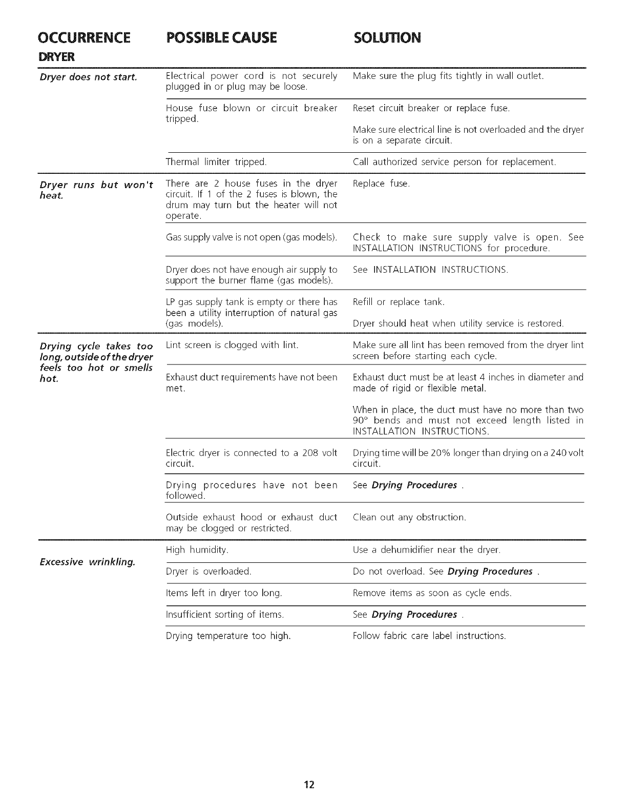 (gas models). Dryer should heat when utility service is restored.