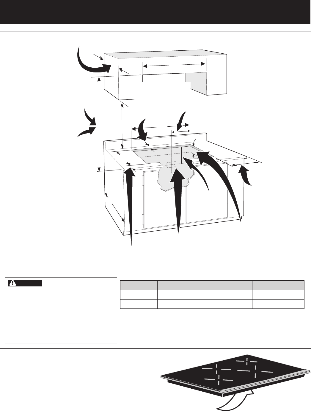 • Minimum distance between cooktop and overhead cabinetry is 30" (76.2 cm).