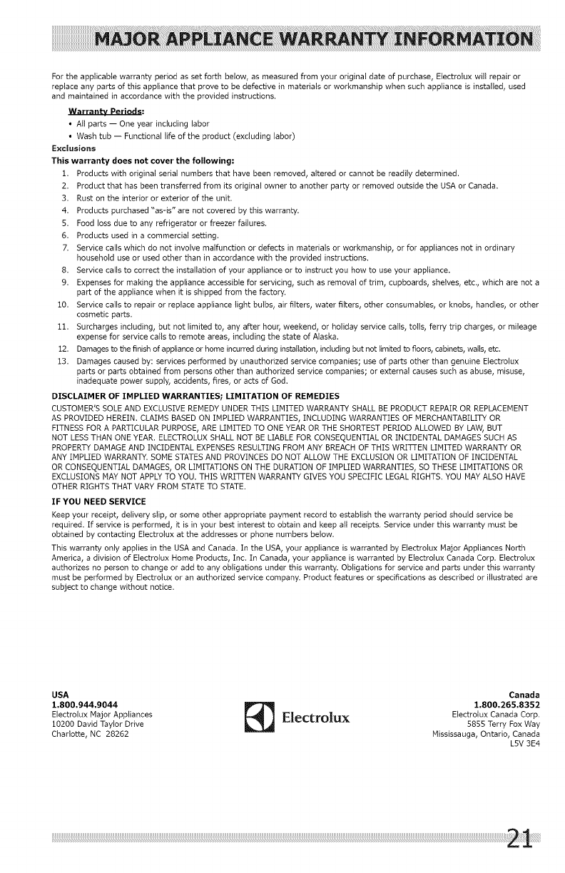 America, a division of Electrolux Home Products, Inc. In Canada, your appliance is warranted by Electrolux Canada Corp. Electrolux