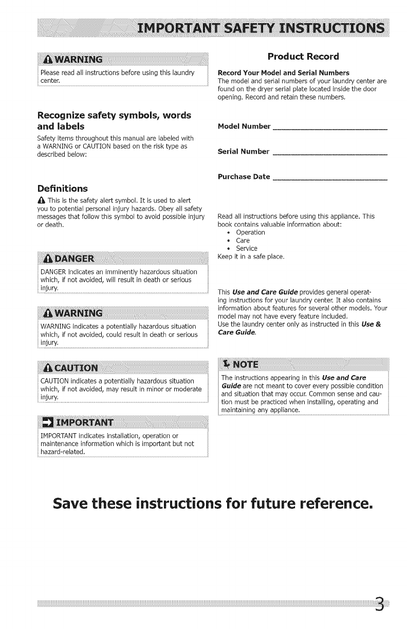 To reduce the risk of fire, electrical shock, or injury to persons when using this laundry center, comply with the
