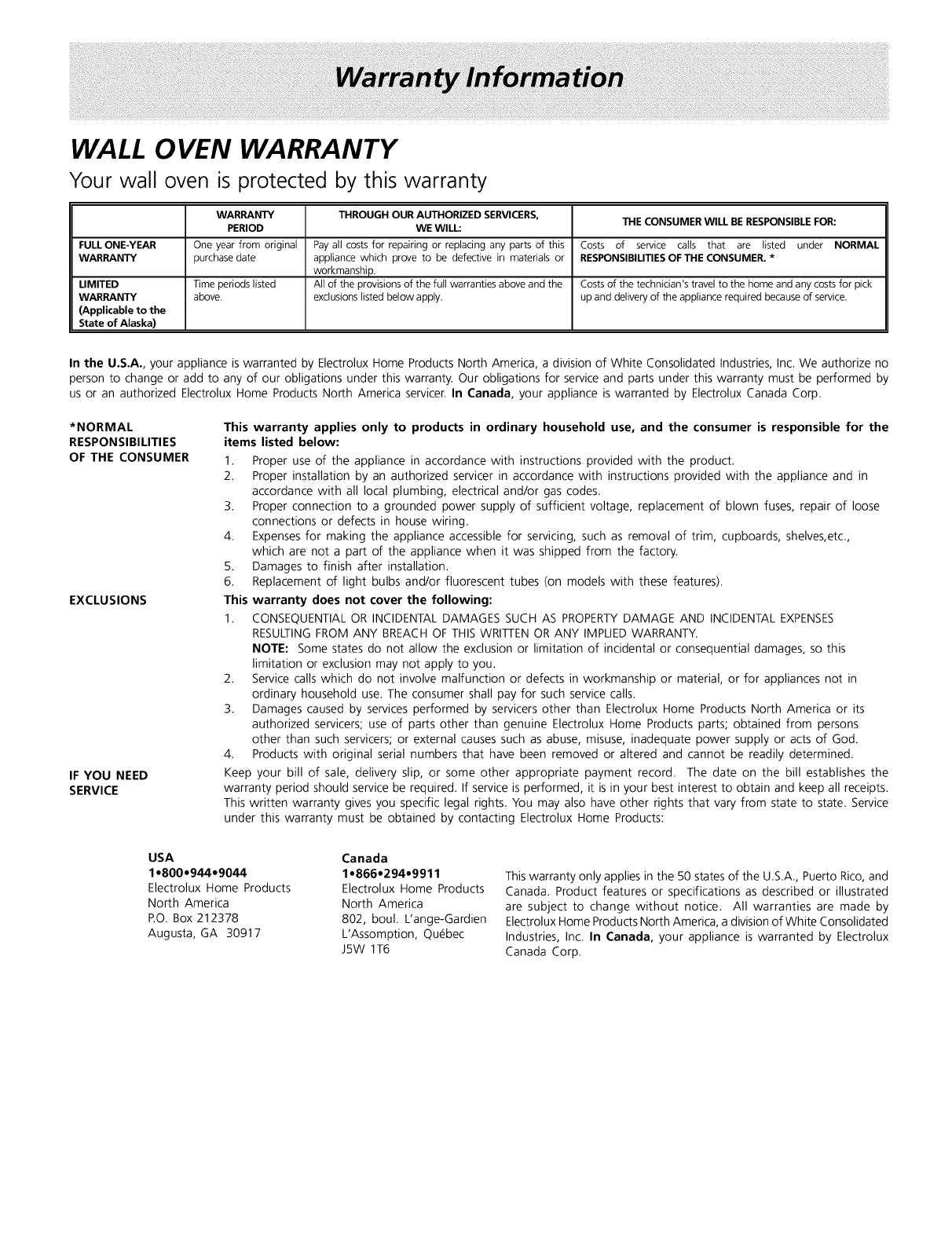 us or an authorized Electrolux Home Products North America servicer. In Canada, your appliance is warranted by Electrolux Canada Corp.