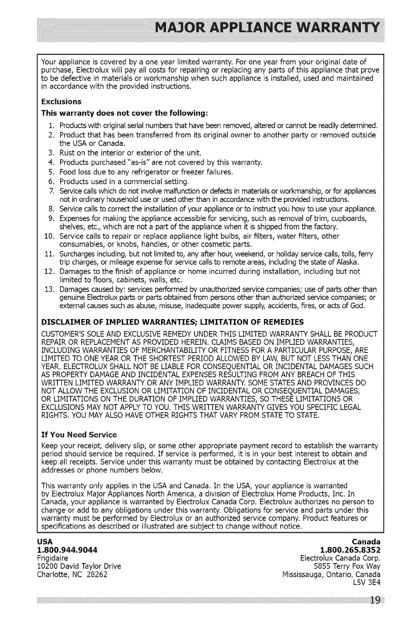 Canada, your appliance is warranted by Electrolux Canada Corp. Electrolux authorizes no person to