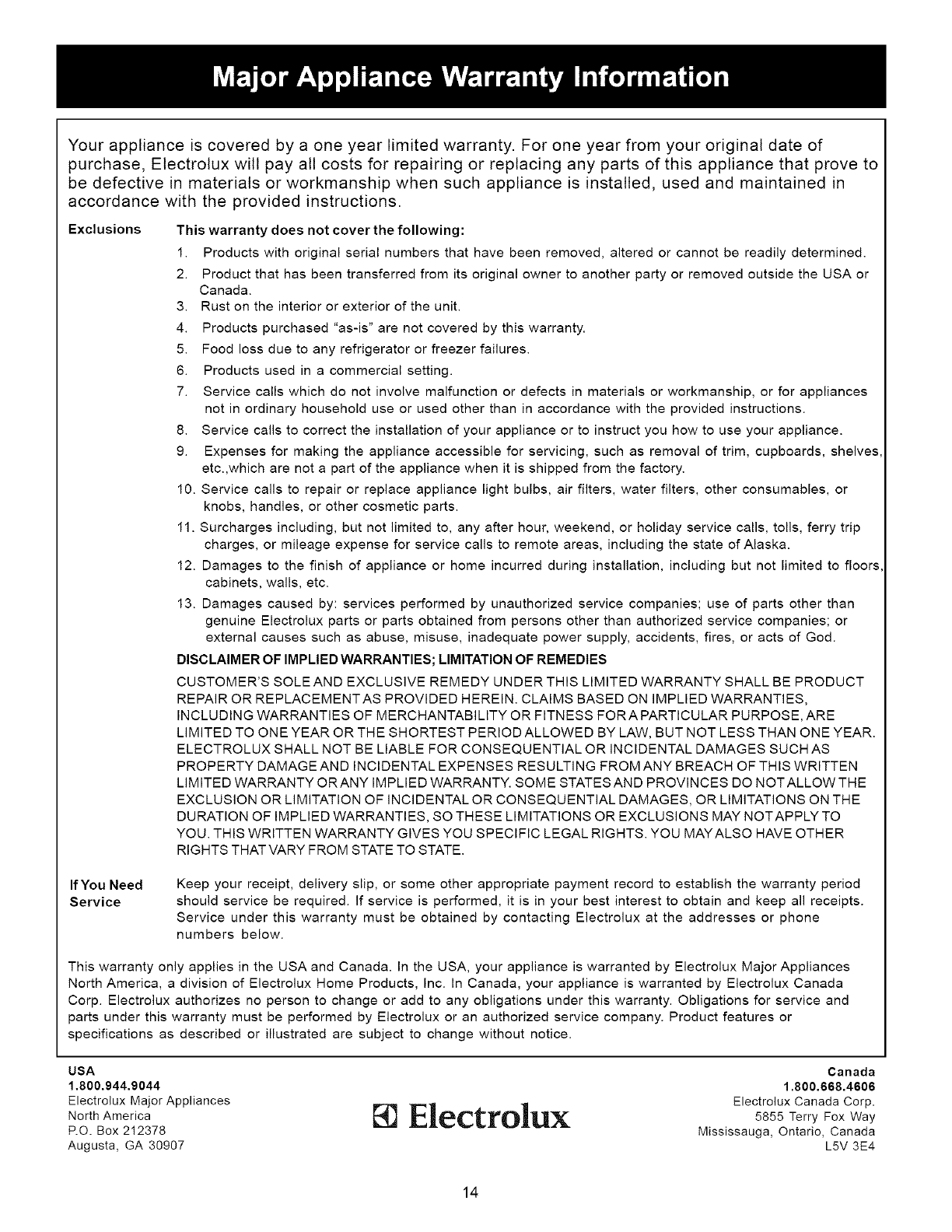 North America, a division of Electrolux Home Products, Inc. In Canada, your appliance is warranted by Electrolux Canada