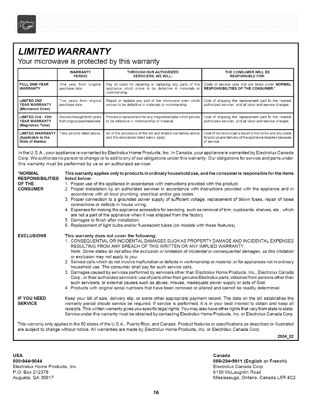 Service under this warranty must be obtained by contacting Electrolux Home Products, Inc. or Electrolux Canada Corp.