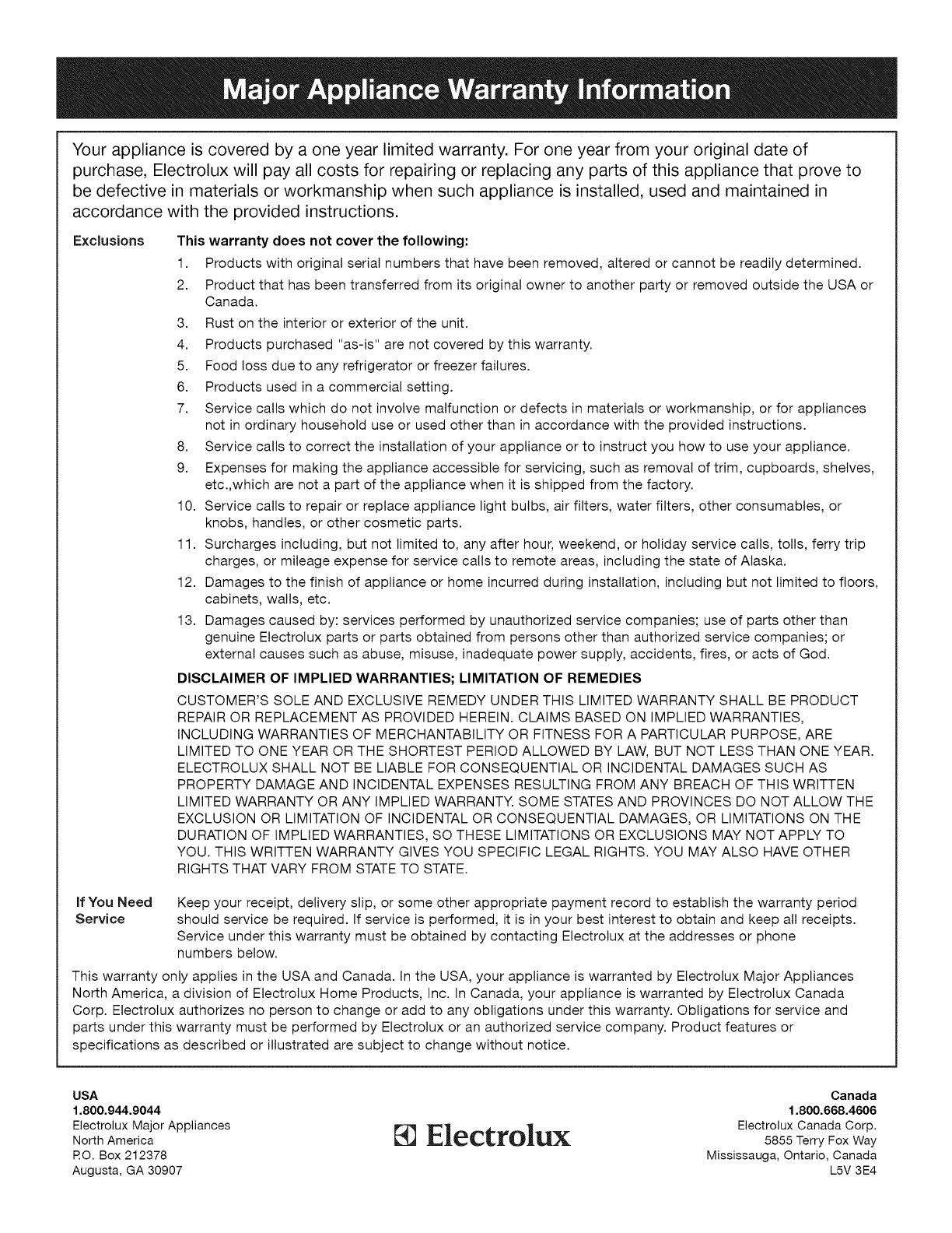 North America, a division of Etectrolux Home Products, Inc. In Canada, your appliance is warranted by Electrolux Canada