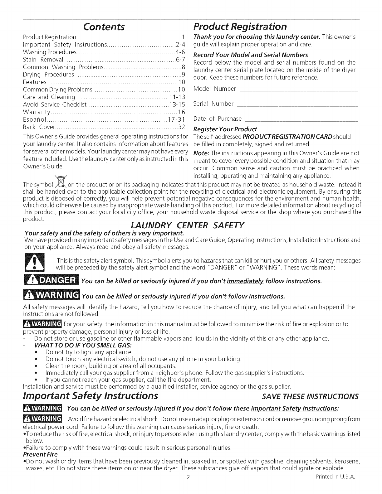 ,,Toreduce the risk of fire, electrical shock, or injury to persons when using this laundry center, comply with the basicwarnings listed