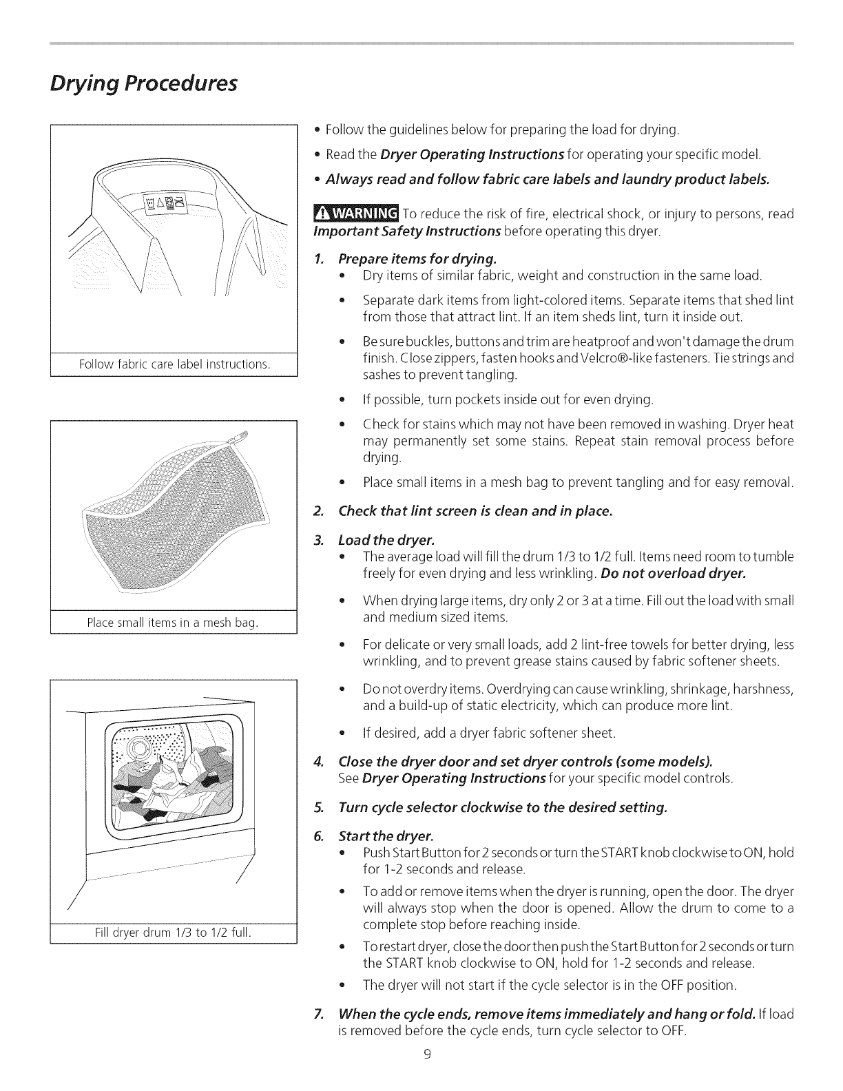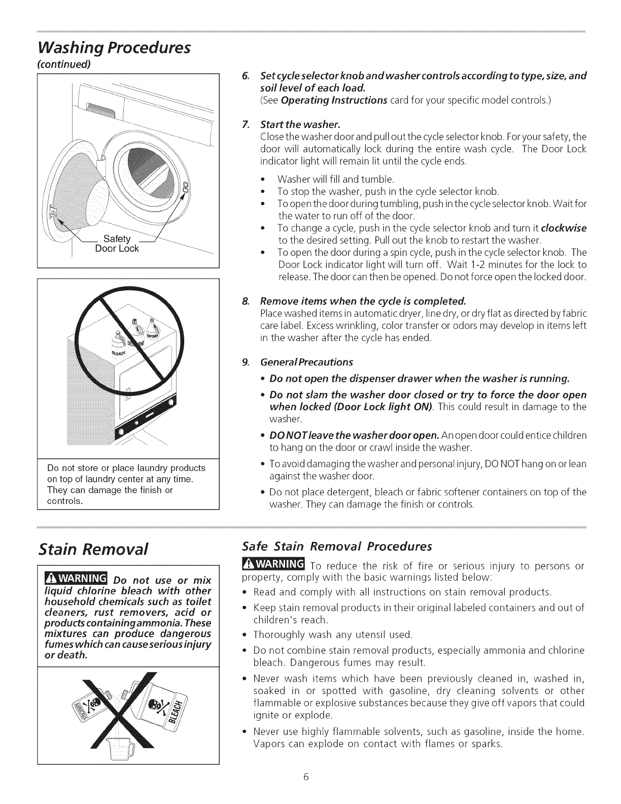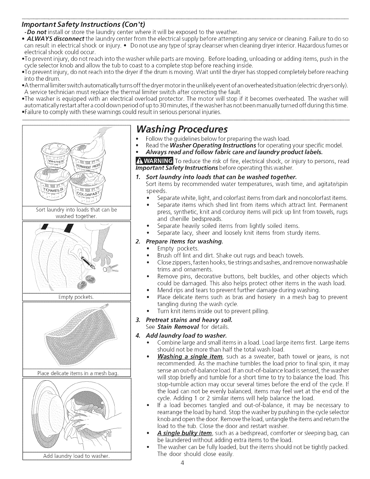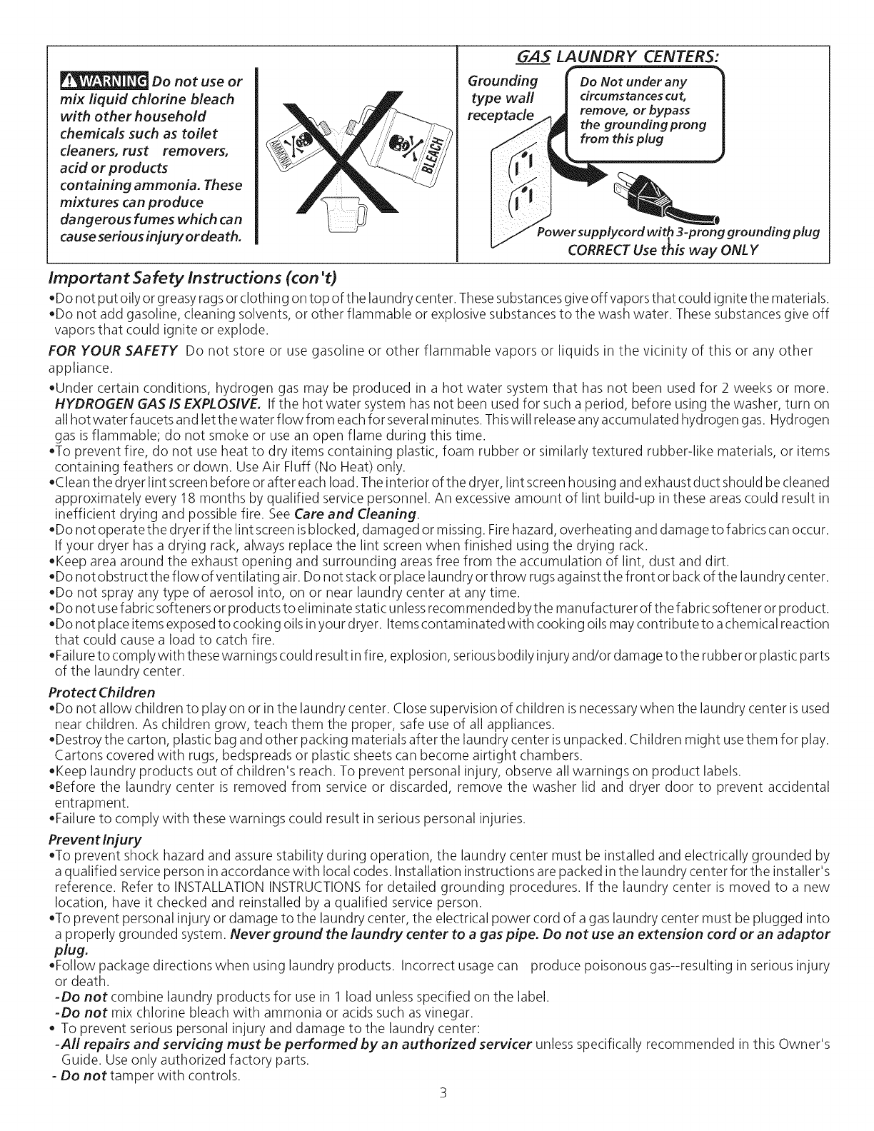 • Do not wash or dry items that have been previously cleaned in, soaked in, or spotted with gasoline, cleaning solvents, kerosene,