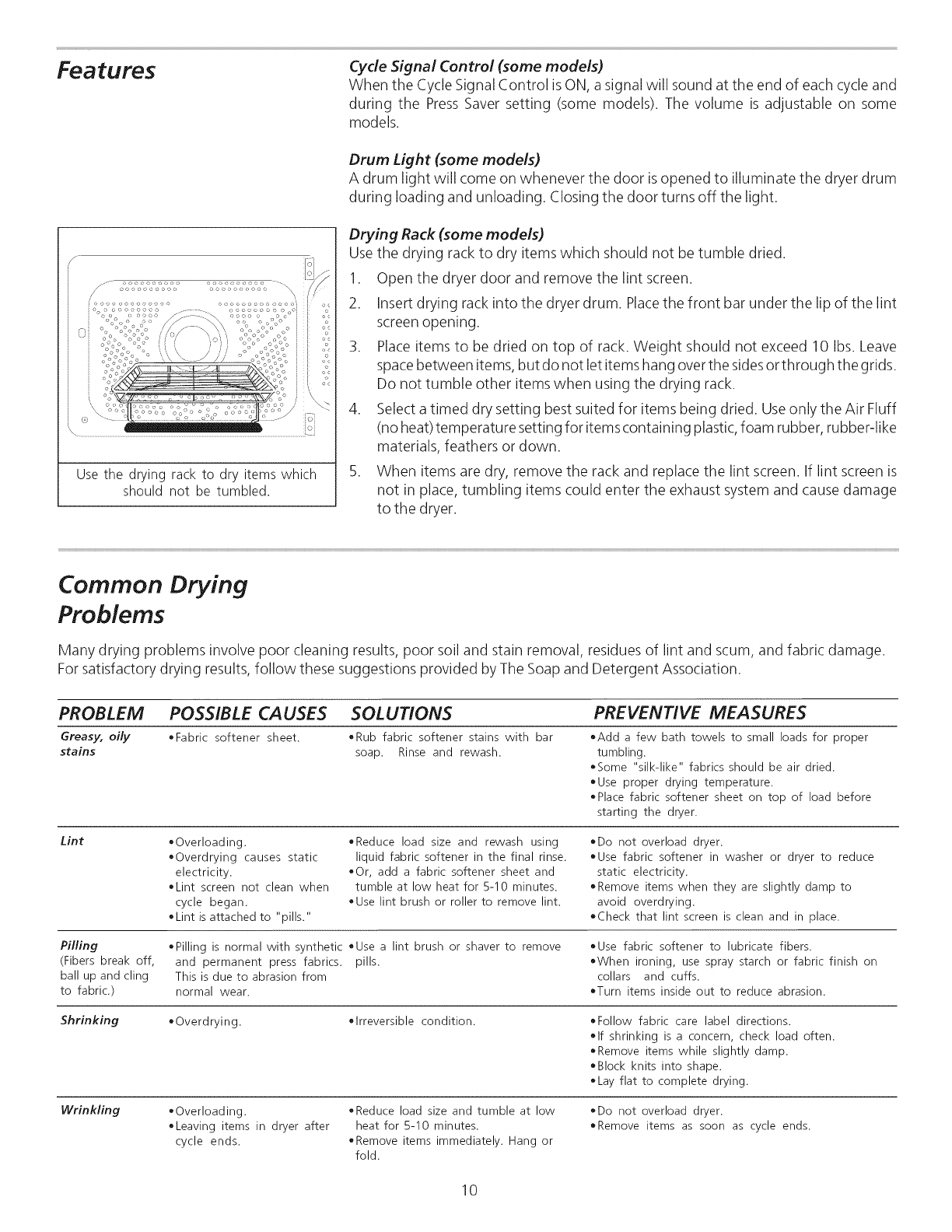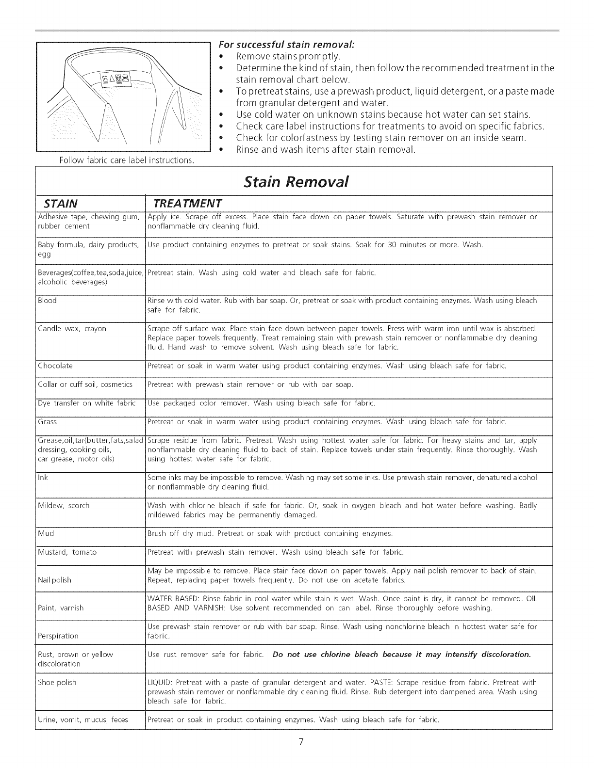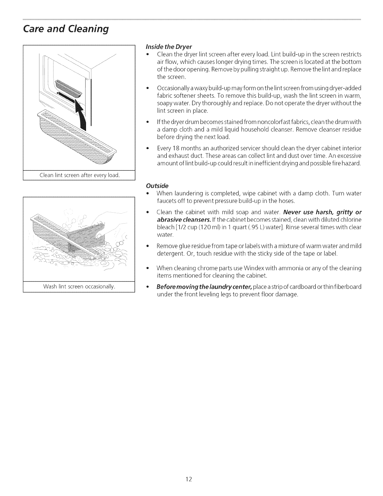 • Do not wash or dry items that have been previously cleaned in, soaked in, or spotted with gasoline, cleaning solvents, kerosene,