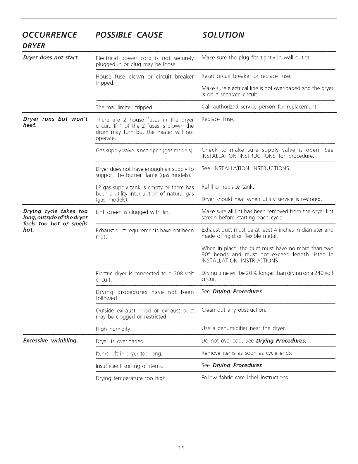 Dryer runs but won't There are 2 house fuses in the dryer Replace fuse.