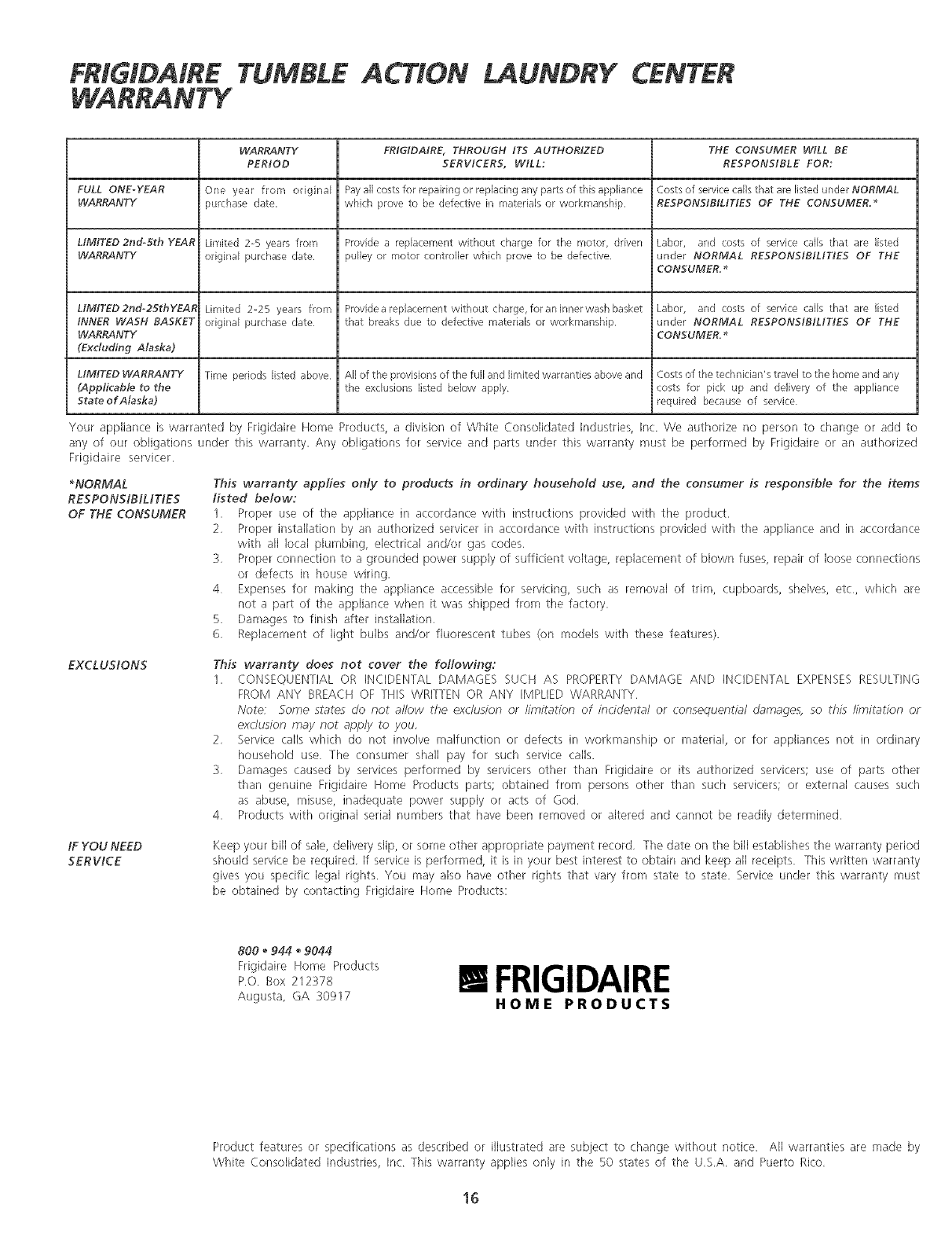 WARRANTY FRIGIDAIRE, THROUGH ITS AUTHORIZED THE CON5UMER WILL BE