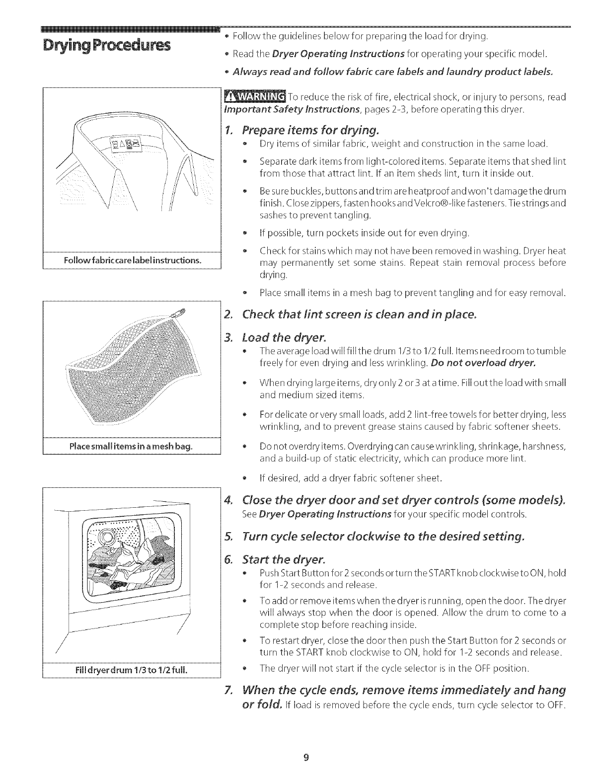 Insufficient sorting of items, See Drying Procedures, page 9,