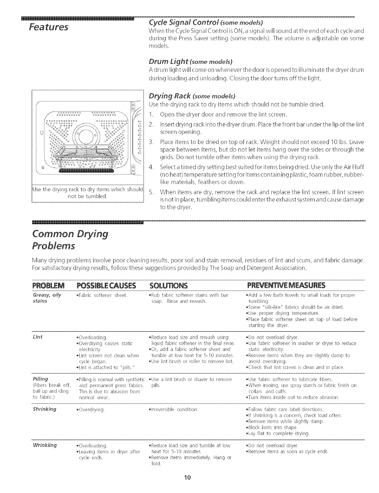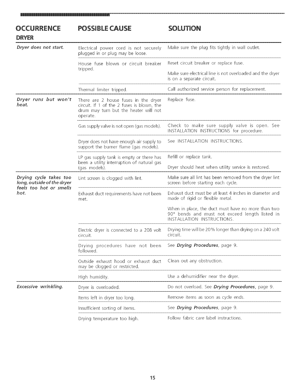 Excessive wrinkling, Dryer is overloaded. Do not overload. See Drying Procedures, page 9,