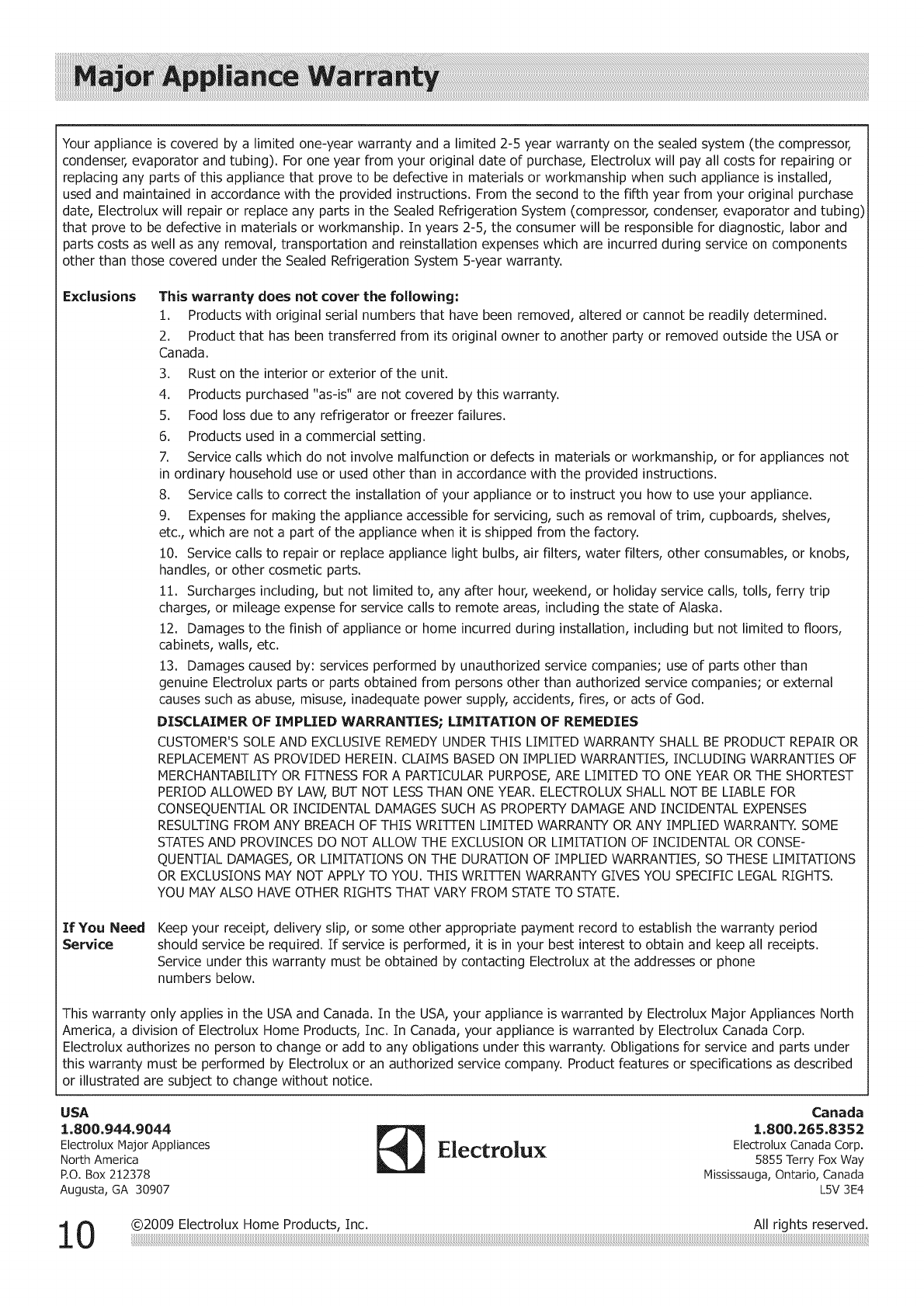 America, a division of Electrolux Home Products, Inc. In Canada, your appliance is warranted by Electrolux Canada Corp.