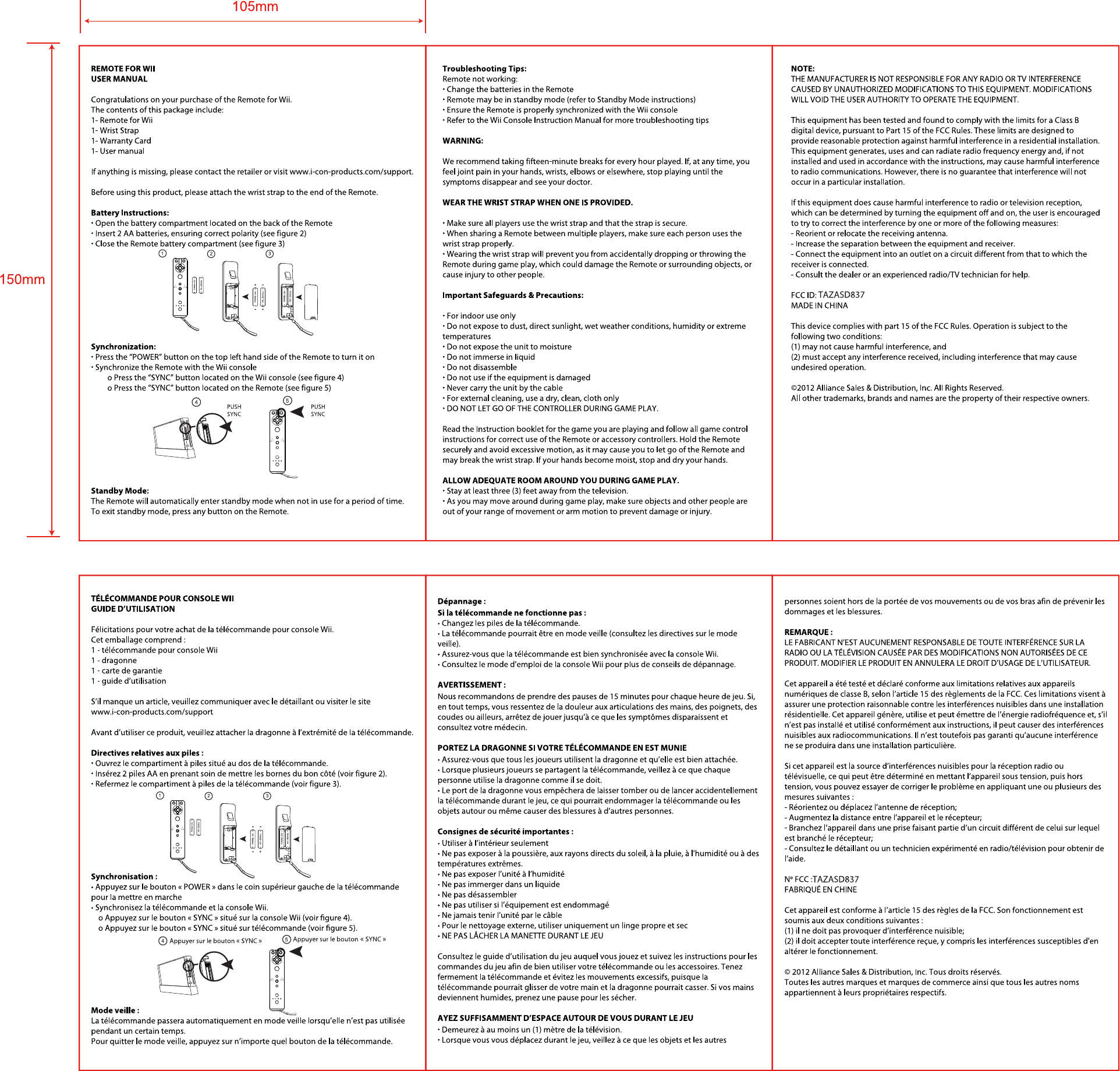 Front Electronics ASD837 REMOTE & PLAYCHUK for Wii User Manual ASD837