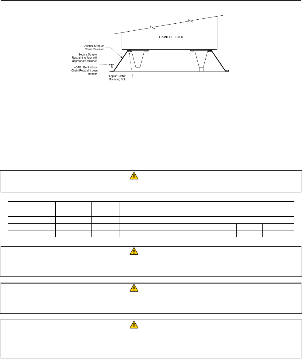 Single fryers equipped with legs must be stabilized by installing anchor straps. All fryers