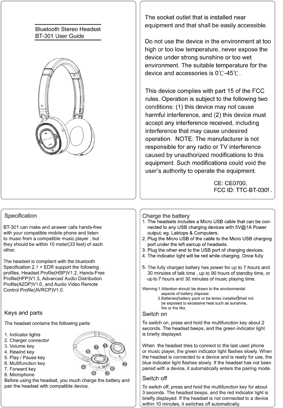 Fujikon Industrial Co., Ltd. Bluetooth Headphones BT 301 user manual 1 rev2 psd