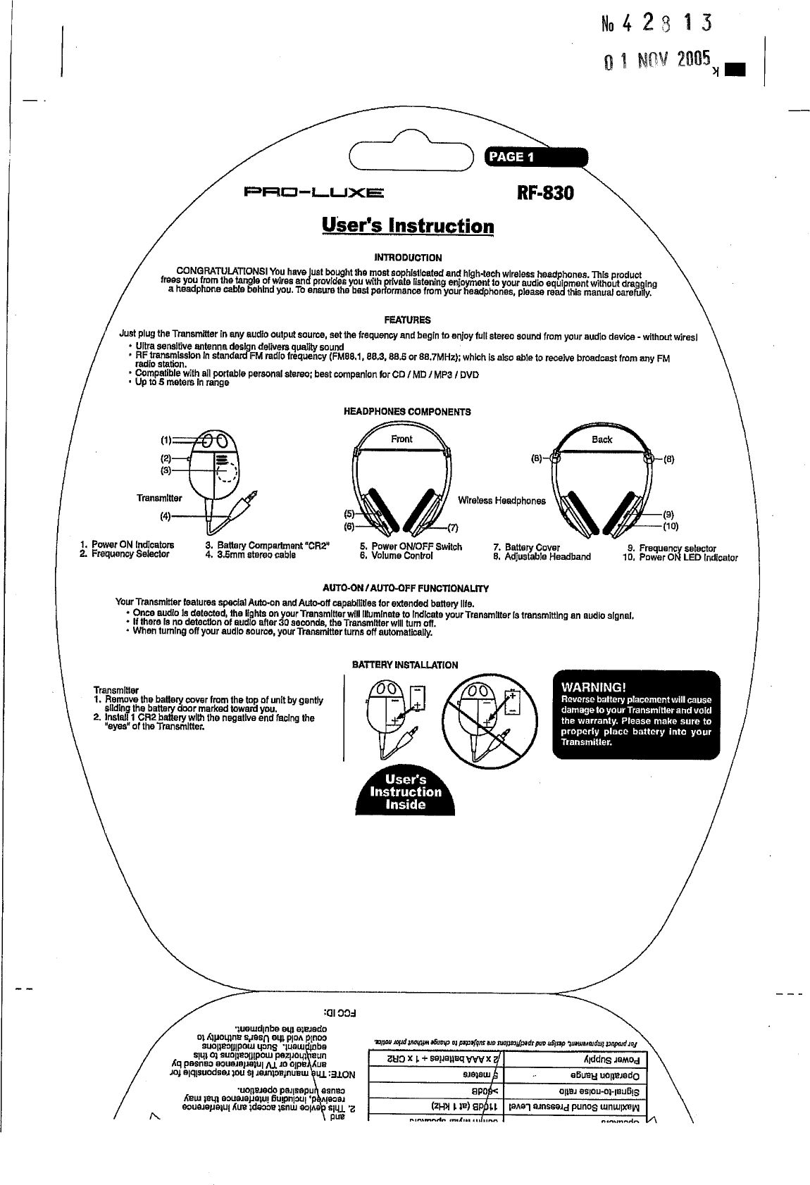 Fujikon RF830 RF WIRELESS STEREO TRANSMITTER User Manual USERS MANUAL