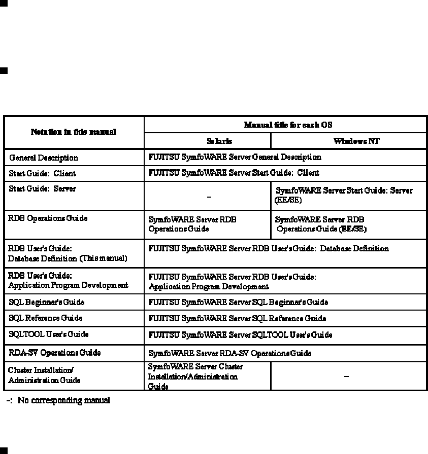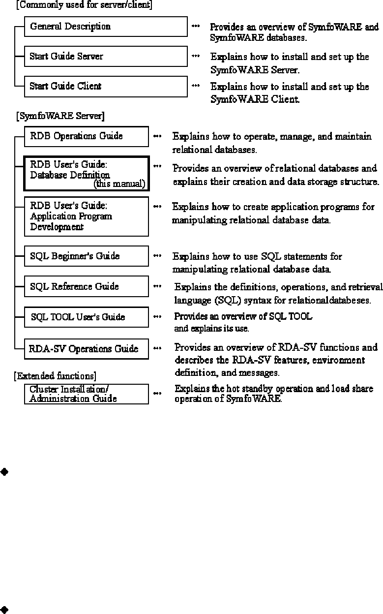 This manual is for users who design and define SymfoWARE/RDB databases. Readers should have the following