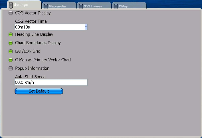 NavData, Tracks, Targets, Weather, Alarms, General setup, Memory card processing,