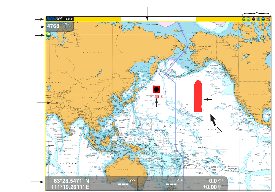 The radar display is available in head-up, course-up and north-up modes and orienta-