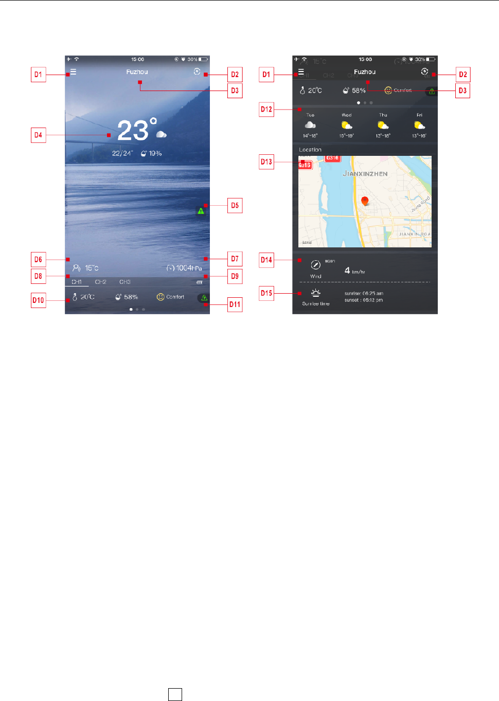 D13: Map display of device location D14: Today's wind speed and direction