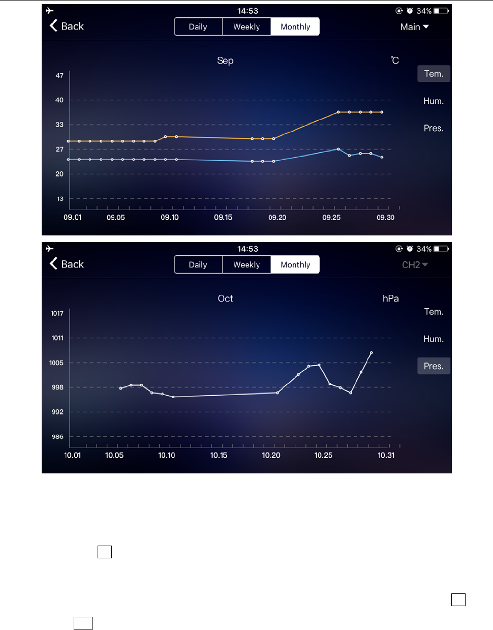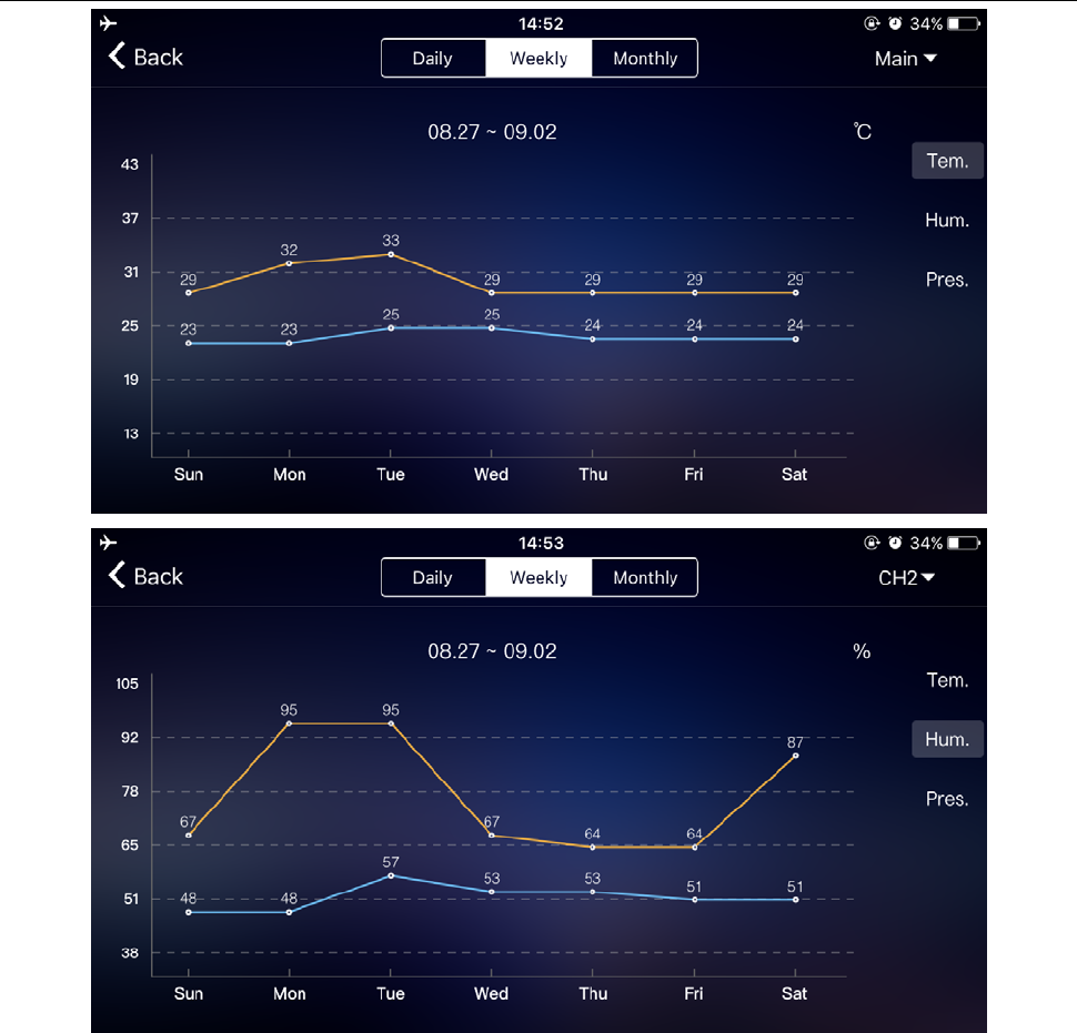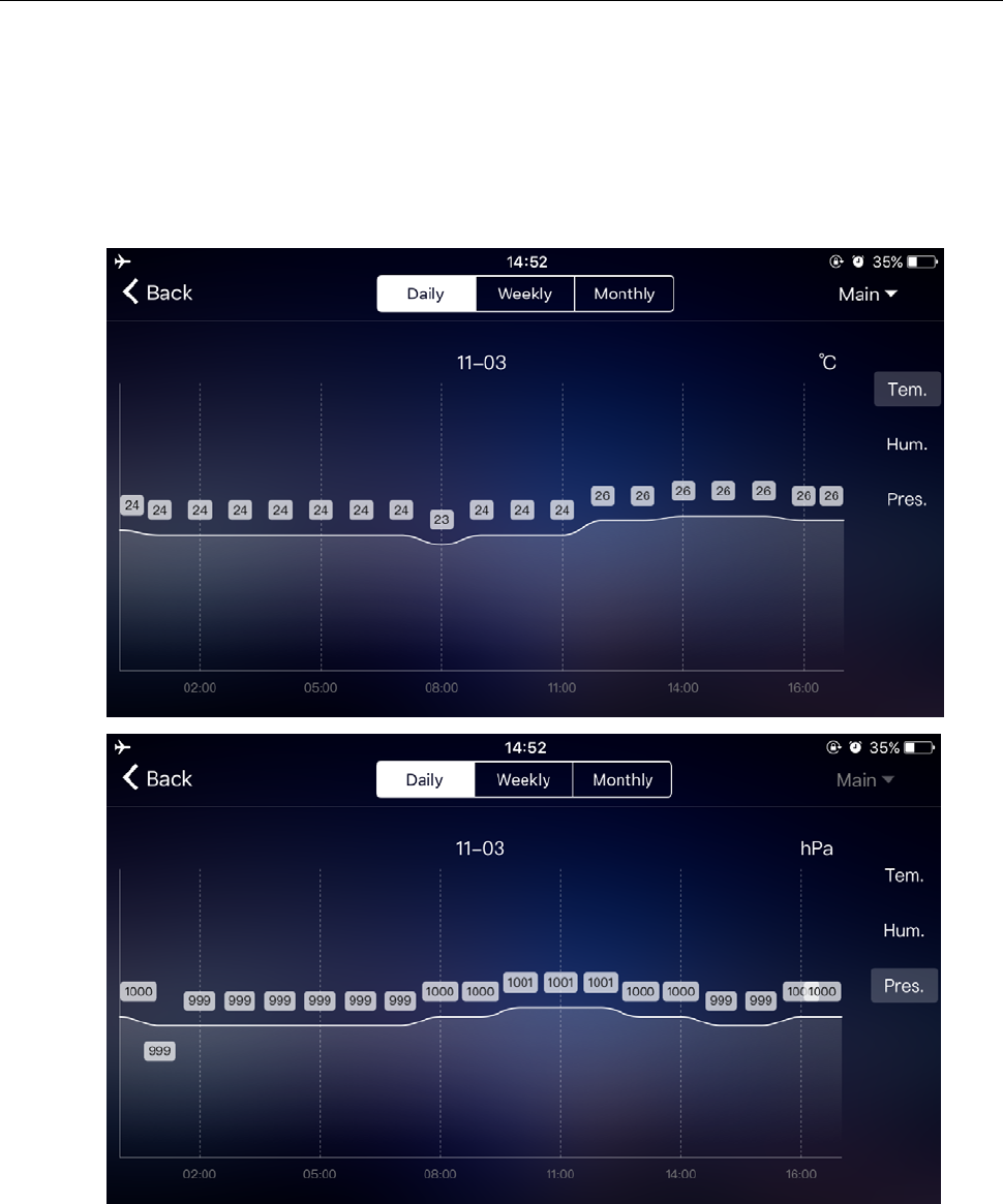 Click the "Tem.", "Hum." and "Pres." on the right side of the screen and select the historical chart record