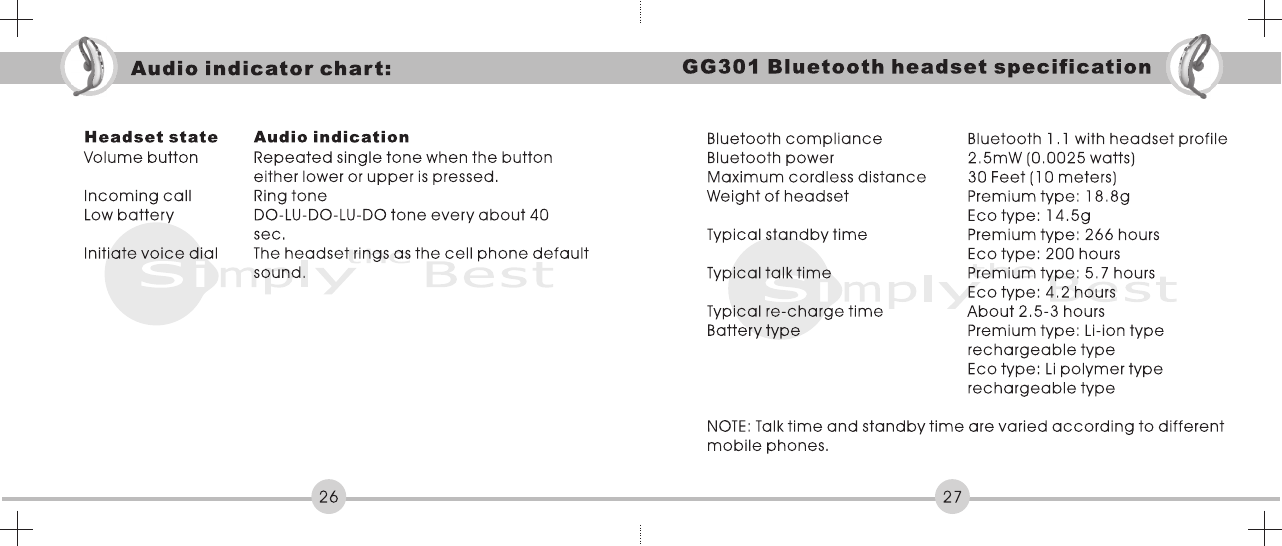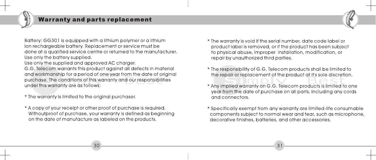 G G Telecom GG301 BLUETOOTH HEADSET User Manual