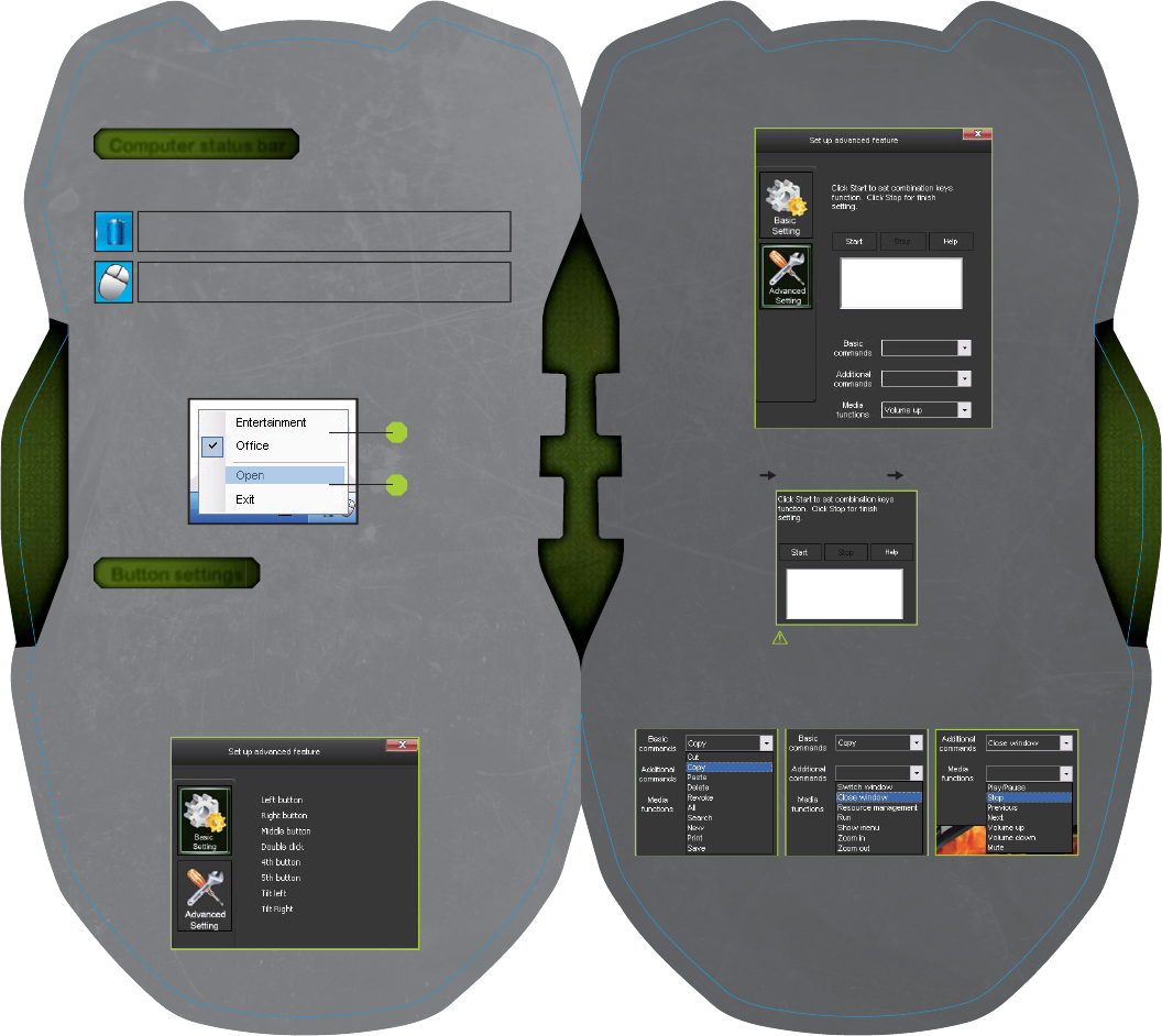 right, button, mid-button, double click, 4 key, 5 key, left moving,