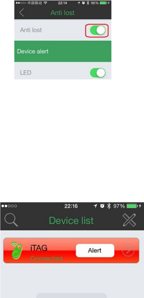 On the “Device” interface, enter into submenu “iTag” item, click “Anti lost”