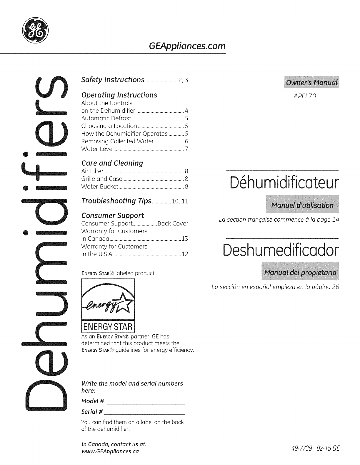 User Manual: GE APEL70LTL1 APEL70LTL1 GE DEHUMIDIFIER - Manuals and Guides View the owners manual for your GE DEHUMIDIFIER #APEL70LTL1. Home:Heating & Cooling Parts:GE Parts:GE DEHUMIDIFIER Manual